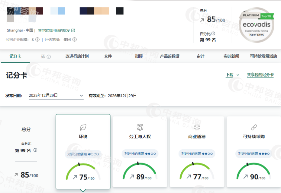 恭贺子谦道具(上海)有限公司2025年12月EcoVadis取得85分的优秀成绩